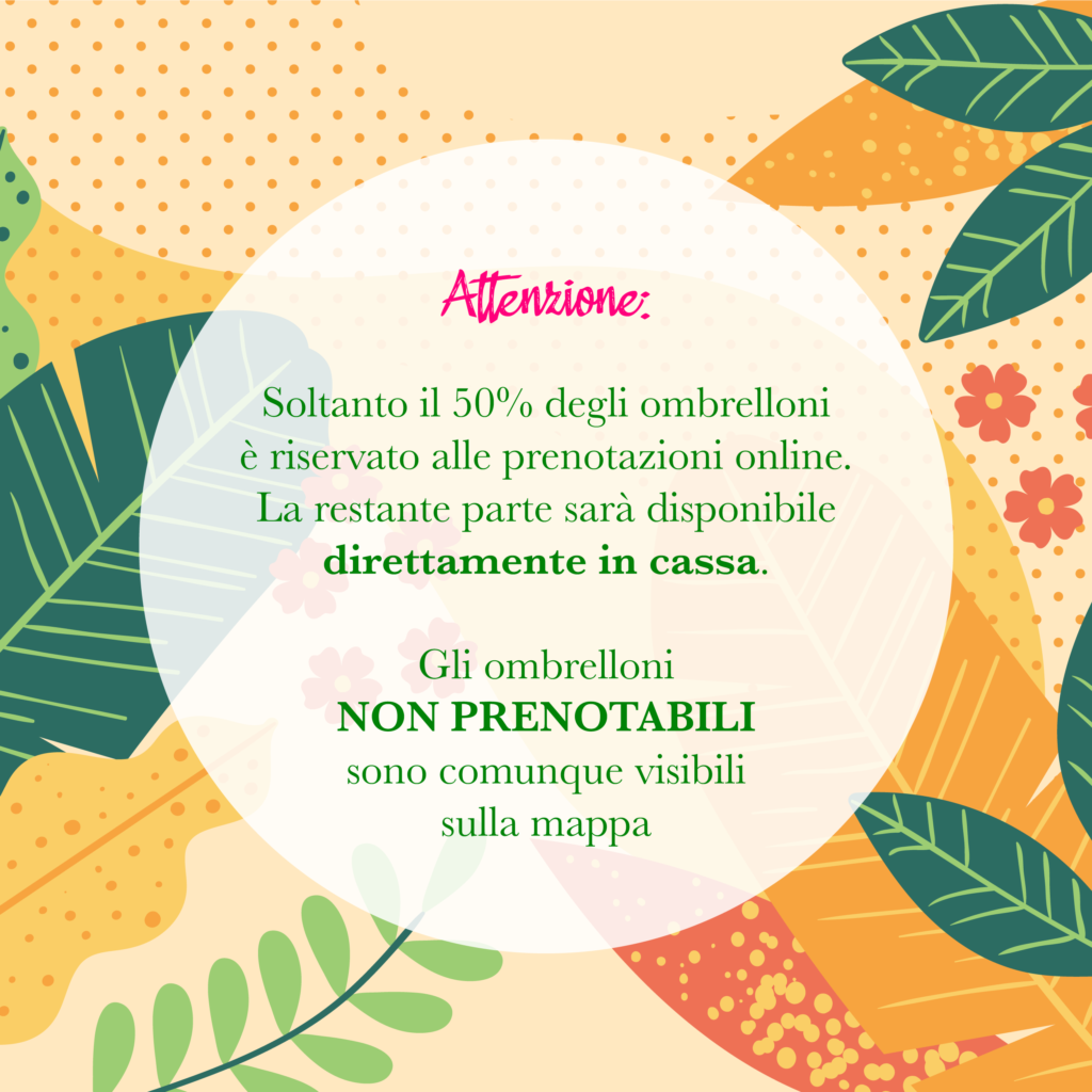 Soltanto il 50% degli ombrelloni è riservato alle prenotazioni online. La restante parte sarà disponibile direttamente in cassa. Gli ombrelloni NON PRENOTABILI sono comunque visibili sulla mappa